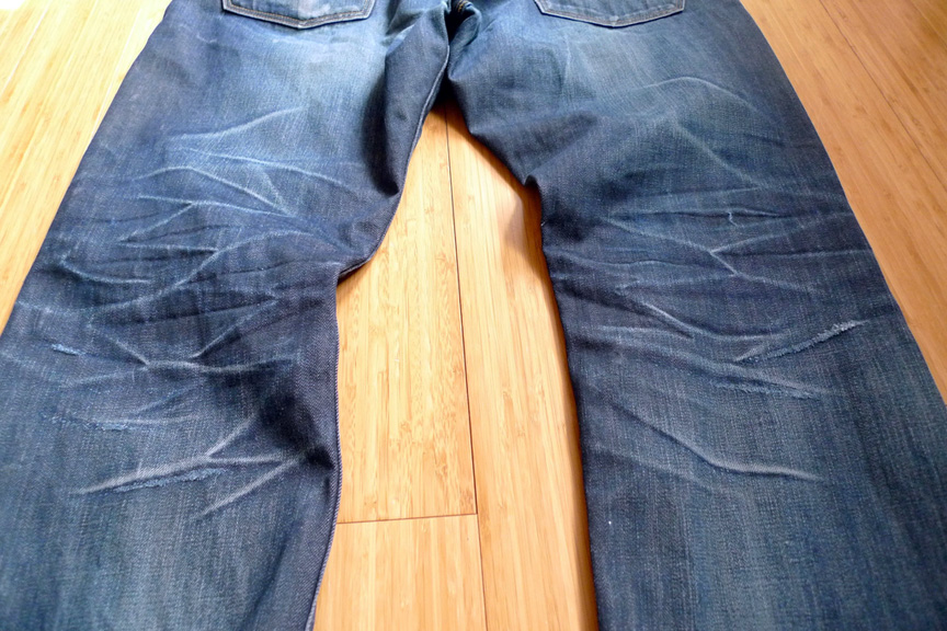 How odd. I was examining my 2007 Gap Japanese denim jeans just yesterday. I never wore them with the frequency you did, so they look less worn. Gap seems to revamp their 1969 every 18 months or so, as the rear patch is different from yours, which is different from the current version. Also mine has a wide blue and white selvedge. I’m just happy that I got them for $13 in the clearance rack. I think I’ve brought the cost of wear down to a nickel in the almost 3 years I’ve had them.