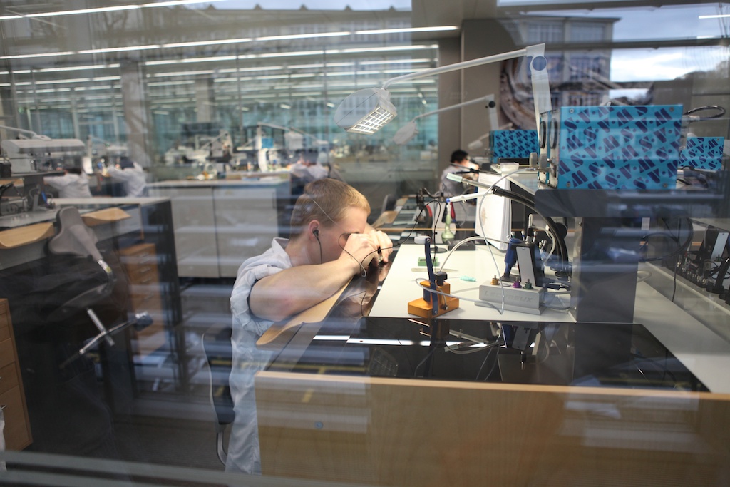 The actual watch makers are located in one of the oldest parts of the main building on the upper floors. There are windows everywhere and the whole space is flooded with natural light. Just to be clear, there is nothing old about anything in this place, except maybe some of the old world manufacturing techniques that are being used to craft the IWC watches. The people working in the factory take measures to keep everything clean and ergonomically correct. The process of making watches is obviously very challenging physically, and IWC has done everything it can to try and maintain as comfortable a process as possible. To this end, everyone working in the factory wears special slipper like shoes and all work at especially designed desks which help to make assembly easier. The watchmakers sit low in their chairs with their arms in special padded nooks on the top of their workspace. After taking a watchmaking class at the end of our factory tour I can say that the working stance looks crazier than it feels when you are working. It feels right when you are focusing on manipulating tiny objects with tiny tools. You can see examples of how the watchmakers work in some of the photos below.