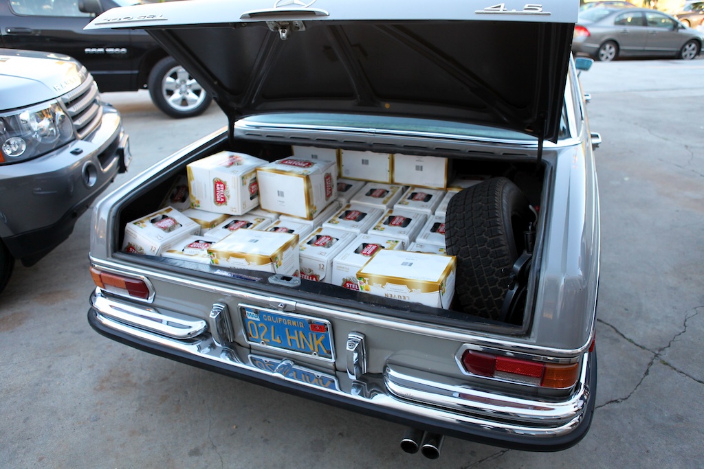 Vintage Mercedes and a trunk full of Stella!! Classy!