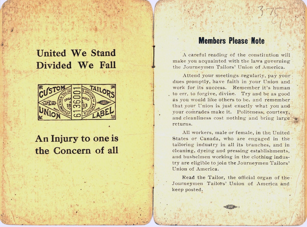 That is such a cool piece of history. A good tailor is hard to find, and this find is extra-relevant with all the concern over unions these days. I wish I could flip through the rest of the booklet.