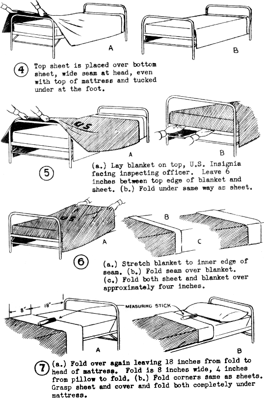 My grandfather, who passes away just a couple of years ago, was a medic in the 7th Armored Division through the Battle Of The Bulge, taught his kids to make beds this way, who tried to teach us the same. Apparently the test is to bounce a quarter on the bunk to check for tightness.