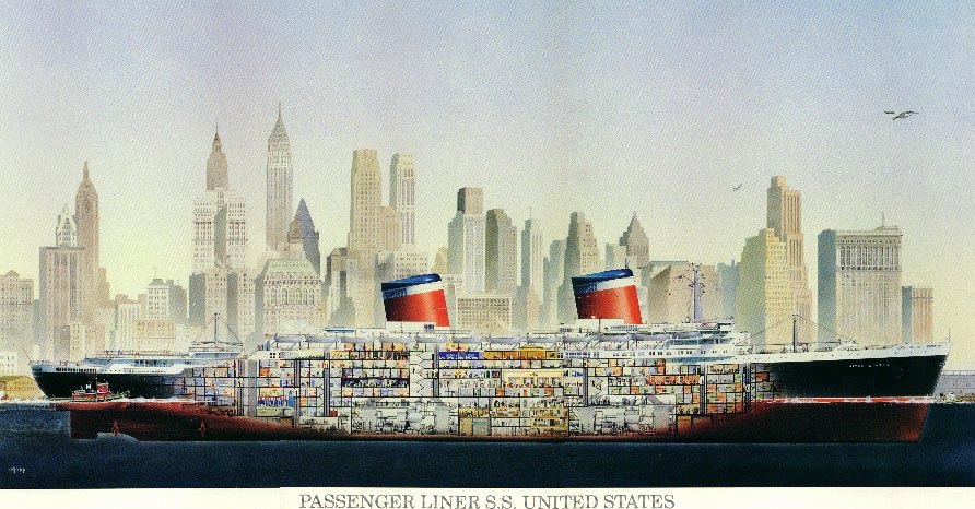 Last month, CBS Sunday Morning did a piece on the history and dire current state of the SS United States, “the most famous ship that didn’t sinkâ€. Even with that motto, the SS United States is relatively unknown by today largely because the popularity of jet travel made ocean liners unnecessary shortly after it first set sail. It remains obscure despite the fact that the S.S. United States still holds the record for the fastest ocean liner to cross the Atlantic. Obsolete almost from the minute the champagne bottle broke across her bow, the once great ship is now in danger of disappearing altogether.